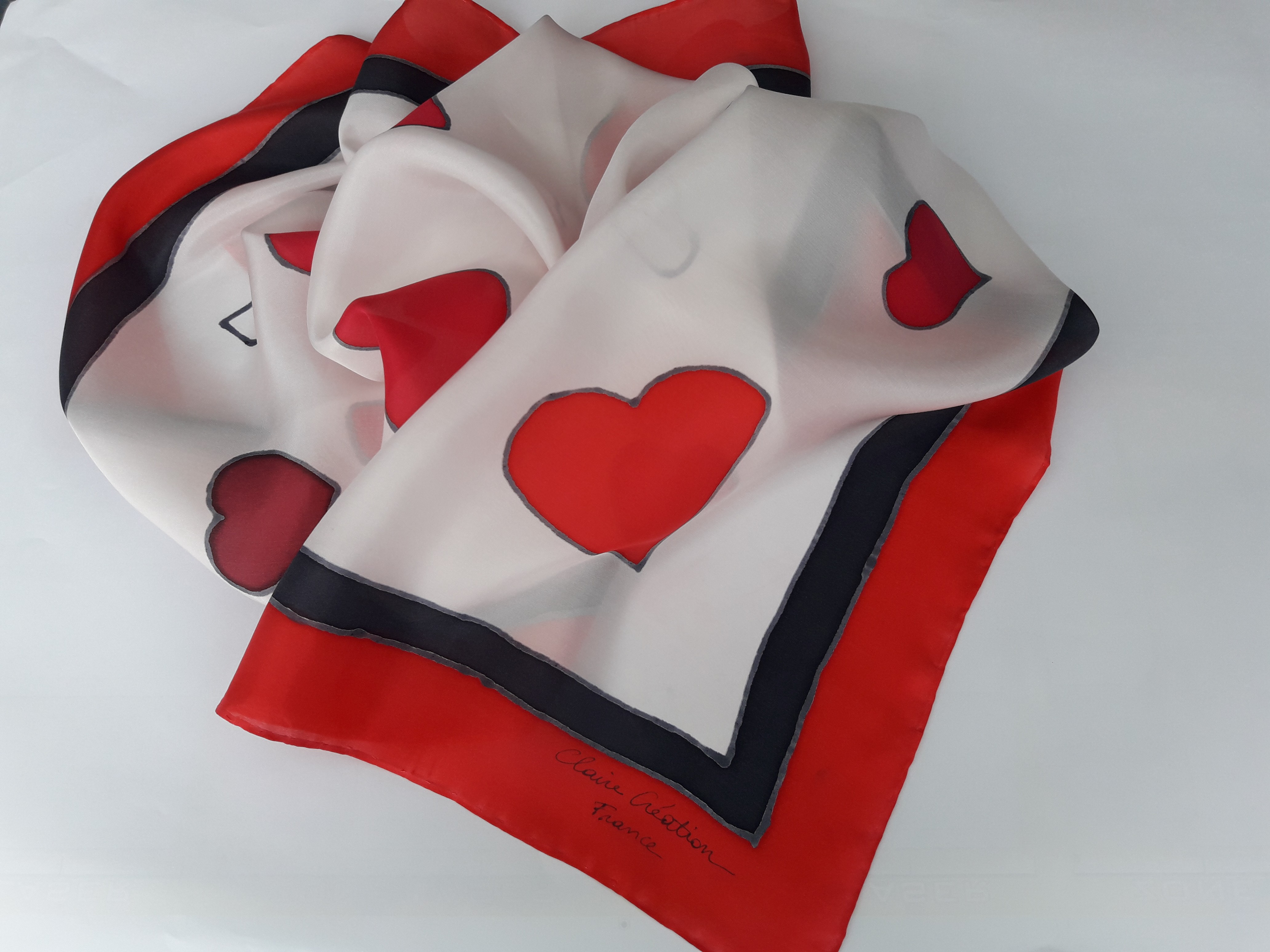 Un superbe foulard en SOIE plein de coeurs ... Il est peint à la main et vous séduira par son originalité. Des cœurs rouges, vermillon, fuschia et bordeaux sur fond blanc.
