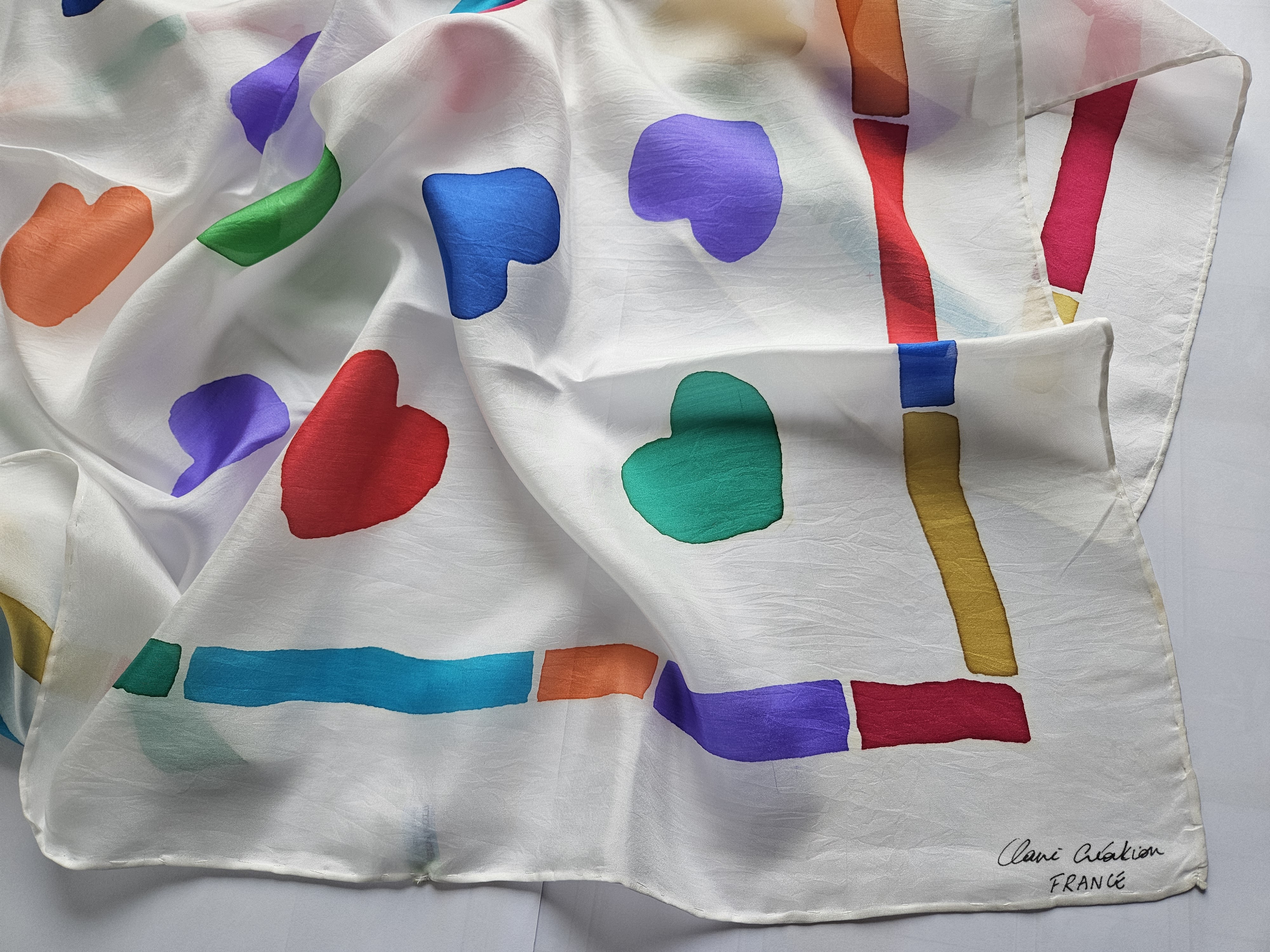 Carré en Soie, Coeurs colorés. Peint main Création unique fait en France